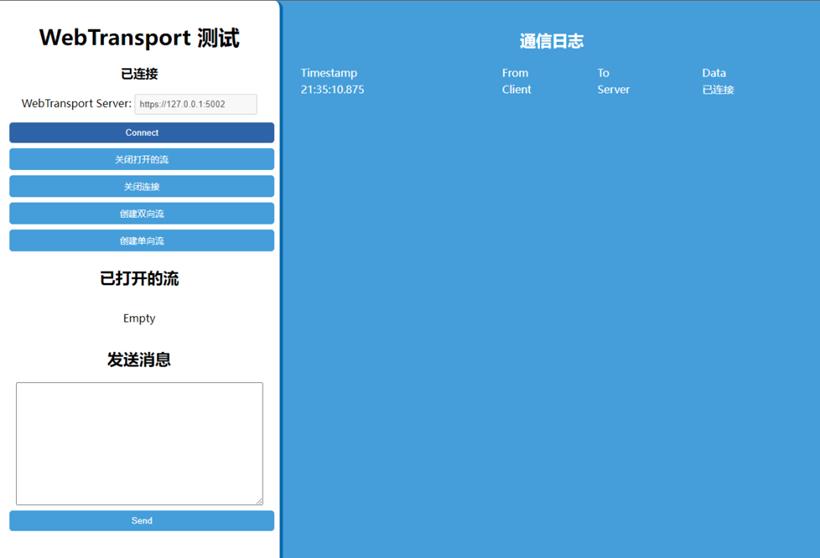 const url = 'https://localhost:5002'; const transport = new WebTransport(url); await transport.ready;连接到服务器后,可以使用 Streams API 发送和接收数据。