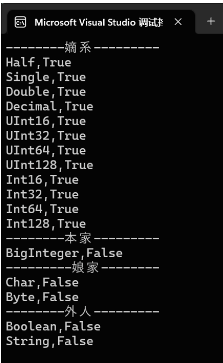 Console.WriteLine($"{t.GetType().Name},{IsDig(t)}");