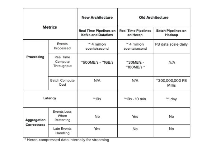 下面是两个架构之间的指标比较表。与旧架构中的 Heron 拓扑相比,新架构具有更低的延迟、更高的吞吐量。此外,新架构还能处理延迟事件计数,在进行实时聚合时不会丢失事件。此外,新架构中没有批处理组件,所以它简化了设计,降低了旧架构中存在的计算成本。