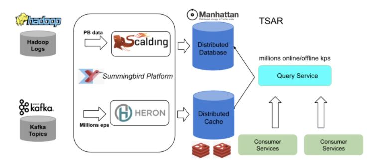 实时数据存储在 Twitter Nighthawk 分布式缓存中,而批处理数据存储在 Manhattan 分布式存储系统中。我们有一个查询服务,可以在这两个存储中存取实时数据,而客户服务则会使用这些数据。