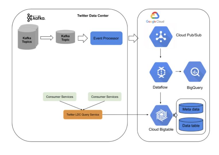 新架构基于 Twitter 数据中心服务和谷歌云平台。我们在内部构建了预处理和中继事件处理,将 Kafka 主题事件转换为具有至少一个语义的 pubsub 主题事件。在谷歌云上,我们使用流数据流作业,对重复数据进行处理,然后进行实时聚合并将数据汇入 BigTable。