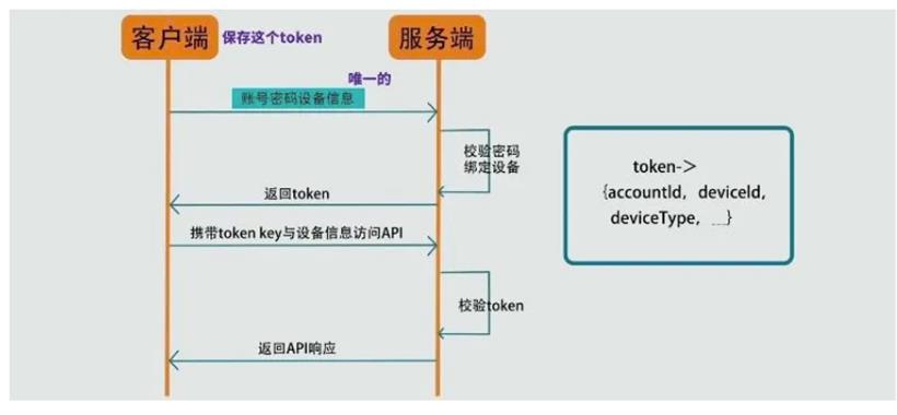 2.服务端就可以通过 token 找到与它绑定的账号与设备信息,然后把绑定的设备信息与客户端每次传来的设备信息进行比较, 如果相同,那么校验通过,返回 AP 接口响应数据, 如果不同,那就是校验不通过拒绝访问。