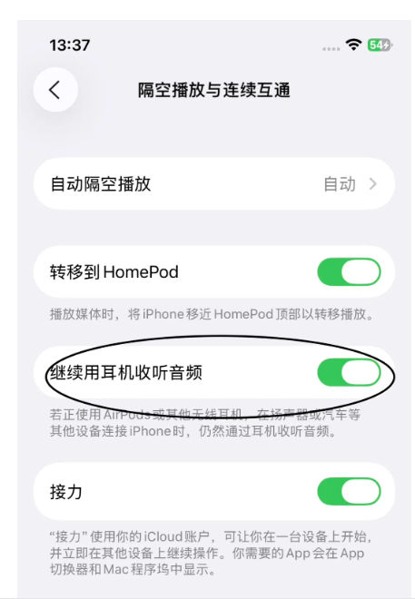 苹果在 iOS 26 里加了个保持耳机音频(Keep Audio with Headphones)的设置。开启后,只要戴着 AirPods,即使 iPhone 连上了 CarPlay 或者家里的蓝牙音箱,音频也会继续在耳机里播。