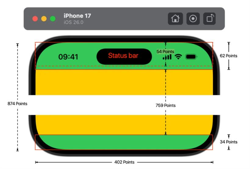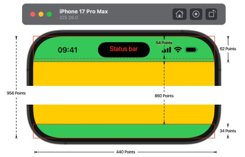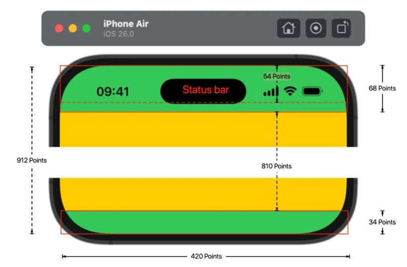 2.iPhone Air 的竖屏顶部安全区域是 68 Points,比其他机型多 6 个 Points