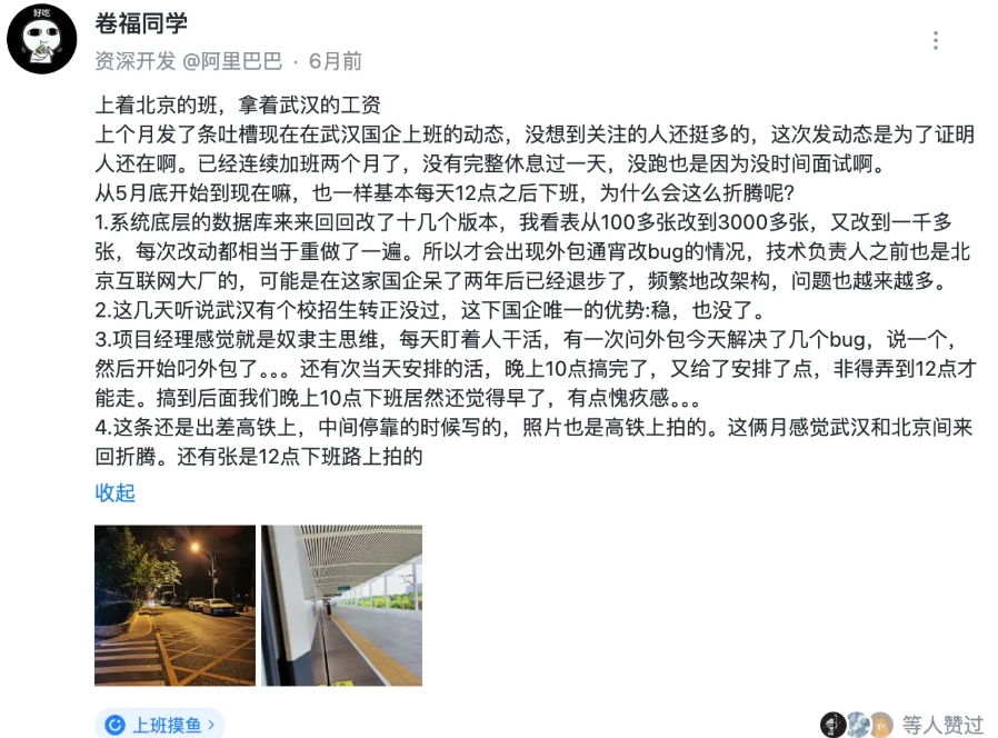 国企平时上下班时间还好,基本都是朝九晚五的,遇到出差的时候,那就不一样了,加班起来比互联网狠太多了。关于加班这事,之前也发过吐槽。
