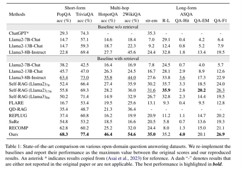把 DRAG 和当前最主流的一些 RAG 方法,比如 Self-RAG、FLARE 等,进行了一场全方位的对比。结果怎么样?