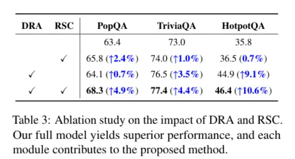 在 TriviaQA 的一个问题里,基线模型因为无法准确评估文档的相关性,被噪声信息干扰,给出了一个错误的答案。而 DRAG 通过它那套“庖丁解牛”加“降噪”的组合拳,精准地找到了正确信息,生成了正确答案。为了搞清楚 DRAG 的成功到底归功于谁,把 DRA 和 RSC 这两个模块单独拿出来测试,做了“消融实验”。