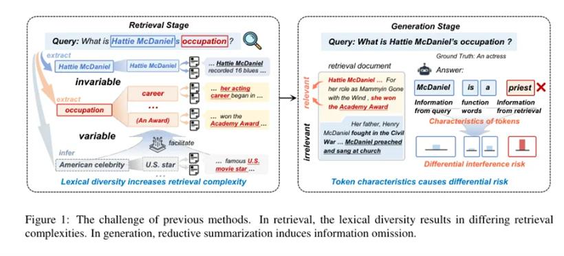 你看,一个简单的问题,里面的词汇就这么复杂。现有的 RAG 模型是怎么做的呢?它们一视同仁,用一个标准去衡量所有词。结果就是,一篇文档里虽然出现了“海蒂·麦克丹尼尔”,但通篇讲的是她的家庭生活,和“职业”八竿子打不着,可因为包含了那个不变的组件,RAG 还是会认为它很相关。而另一篇详细介绍了她演艺生涯和获奖经历的文章,仅仅因为没有出现“职业”这个原词,反而可能被 RAG 忽略掉。这就是典型的“只见树木,不见森林”。