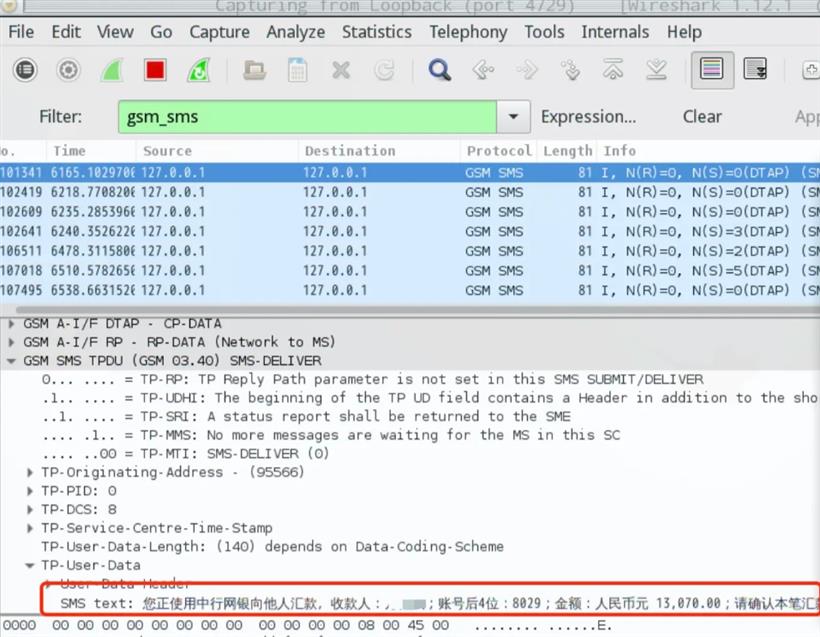 经过硬件修改后的 C118,刷入特殊的固件,连接到Linux机器,启动脚本扫描频段,用WireShark抓包,就能收到其他人的短信了: