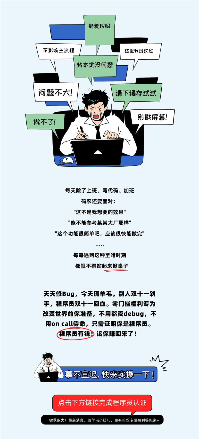 就在刚刚,我偷偷刷到一张图,上面写:“程序员双十一回血计划”。我第一反应是:又来骗我写代码?结果仔细一看,居然是零门槛福利,还不用熬夜 debug、不用 on call 待命,只要证明你是个程序员……