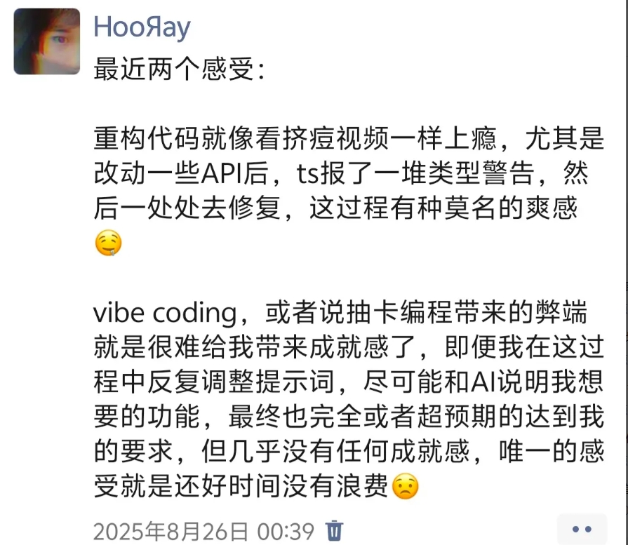 生成式 AI 带来了效率的提升,同时也消磨了我写代码的热情,我曾经在朋友圈也吐槽过:
