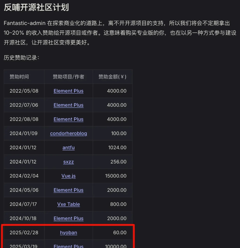 我不知道如何去分析其中的原因,或许是竞品变多,这一年我确实看到几个新冒头且还不错的开源项目;又或许是AI发展迅猛,减少了使用这类产品的需求;也有可能是因为产品曝光量降低,因为 给 Element-plus 的赞助刚好在10月份截止。