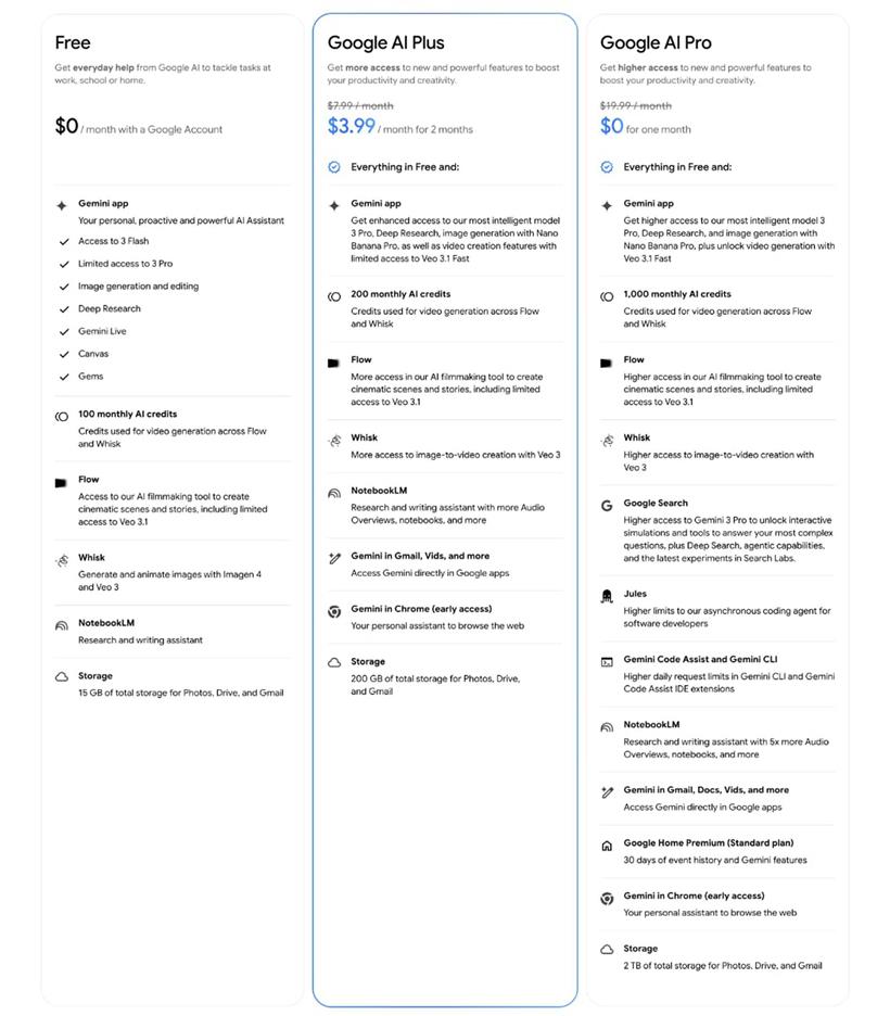 相较之下,月费19.99美元的"AI Pro"套餐提供更多权益:更高的AI生成额度、更完整的Flow与Whisk工具访问权限、谷歌搜索中的Gemini 3 Pro集成、更高的双子座编程助手日调用限额、Gmail及文档等谷歌应用中的双子座功能、Google Home高级版访问权以及2TB云存储空间。