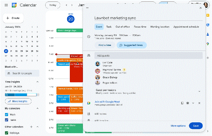 谷歌日历里一个非常亮眼的 AI 功能是 “帮我安排”。你不用手动查看每个人的空闲时间,只需描述需求,Gemini 就会根据所有人的日历推荐最佳时段,甚至可以考虑个人偏好,比如避开早间时段。它还会连接你的 Gmail,智能识别可预约时间,而不是盲目推荐。Gemini 还能辅助创建日程。你只需输入简单指令,比如 **“和尼克吃午饭”**,它就会自动生成完整的日历事件,包含日期、时间建议甚至地点信息。它也优化了改期流程。如果会议需要调整,Gemini 会推荐冲突最少的备选时间,不用你再手动核对所有人的日程,对大型团队会议尤其友好。