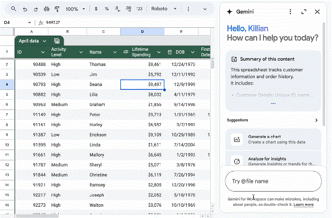只需一句指令,Gemini 就能从邮箱、聊天软件和云端硬盘中提取相关信息,生成结构完整的电子表格。它还能帮你生成图表,让数据更直观。