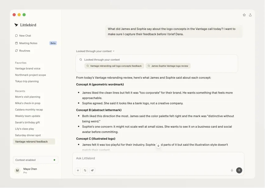 最近,一家名为 Littlebird 的新初创公司,正在做类似的事,但采用了略有不同的思路。Rewind 这类应用会存储截图或者其他视觉数据,而 Littlebird 则是 “读取” 屏幕内容,把上下文以文本格式存储下来。这款产品的核心思路是:既然它一直在读取你的屏幕内容,你就不需要为了提升生产力额外提供上下文信息。这家初创公司认为,很多 AI 工具都在想方设法吸引用户注意力、造成干扰,而 Littlebird 可以在后台静默运行,只在你需要的时候才出现。