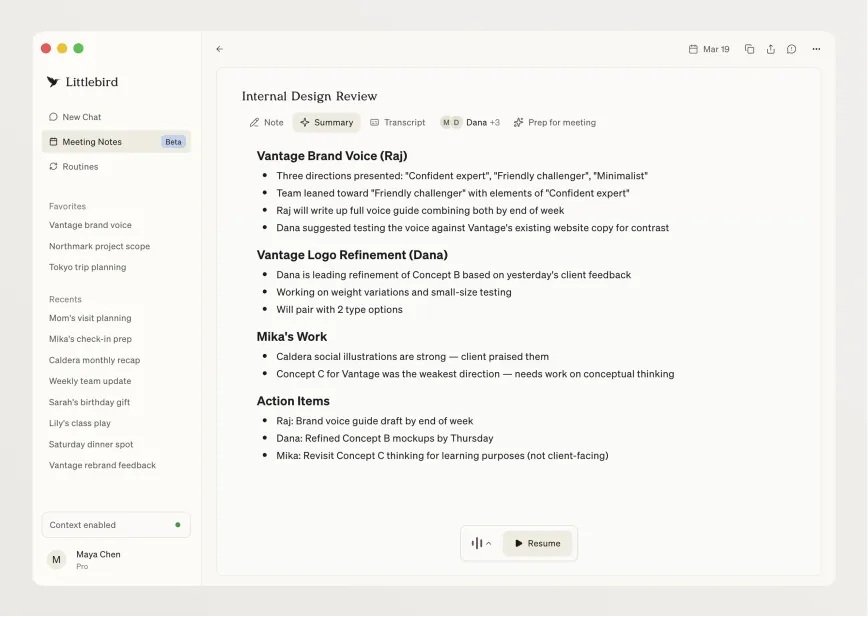 Littlebird 还内置了一款类似 Granola 的 AI 笔记工具,它可以调用系统音频,在后台捕捉会议的转录内容,自动生成会议笔记和待办事项。当你打开会议详情页的时候,还有一个 “会议准备” 功能,它会把过往会议、邮件、公司历史的上下文都纳入考量,给你提供更多和这场会议相关的信息;这个功能还会从 Reddit 这类平台抓取信息,告诉你用户对某个产品或公司的看法。