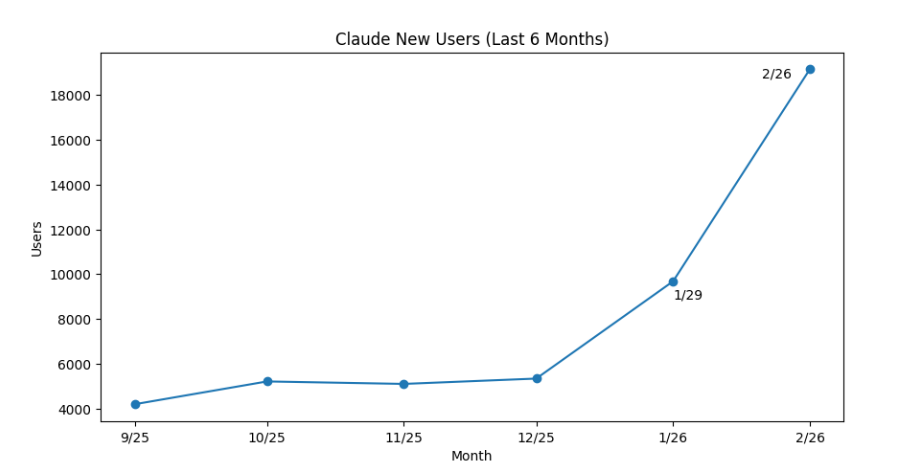 而恰恰是这段舆论发酵的时间,成为了 Claude 用户增长最快的阶段 —— 从 1 月下旬媒体曝光争端,到 2 月底阿莫迪发表声明,新用户的增长曲线出现了陡峭的上扬。对于很多反感 AI 技术被用于军事监控、武器研发的消费者来说,Anthropic 的 “硬刚”,恰恰戳中了他们对 AI 安全的核心诉求,不少人用付费订阅的方式,为这家坚持原则的公司投票。