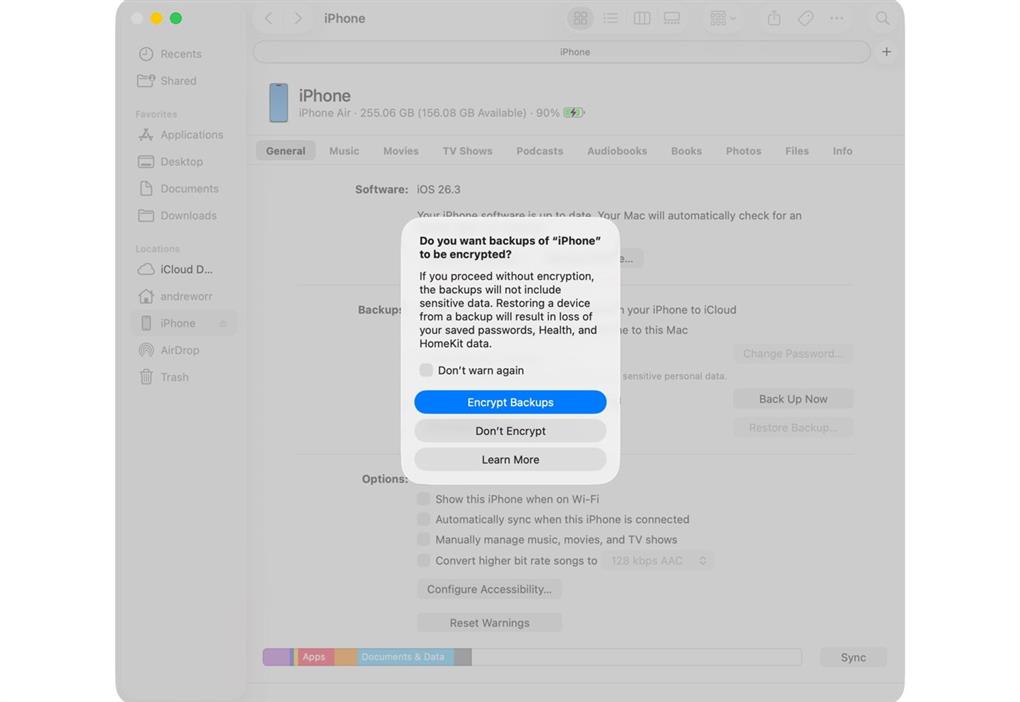 (配图:Mac 弹窗提示是否加密 iPhone 备份,提供加密备份、不加密、了解更多三个选项)