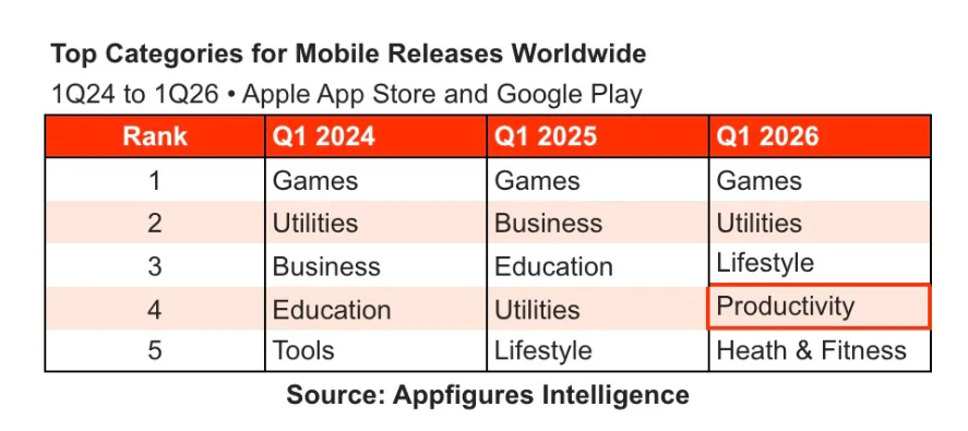 但现实却走向了另一个方向:AI 非但没有取代应用,反而让创建应用的门槛被彻底拉低,推动了 App Store 的复兴。这场新的应用淘金热,正在由那些有创意、但原本缺乏移动软件设计技术的普通创作者引领 ——AI 工具让他们也能轻松把想法变成实际的应用。从应用的分类数据也能看出这一变化。截至 2026 年第一季度,移动游戏依然占据了全球新应用发布的最大份额,延续了此前的趋势。但其他类别的应用正在快速崛起:“生产力” 应用首次进入了发布量的前五名;“工具” 类别上升至第二位,“生活” 应用则从去年的第五位升至第三位,“健康与健身” 类应用也成功跻身前五,这些都是普通人借助 AI 工具就能快速开发的实用类应用。