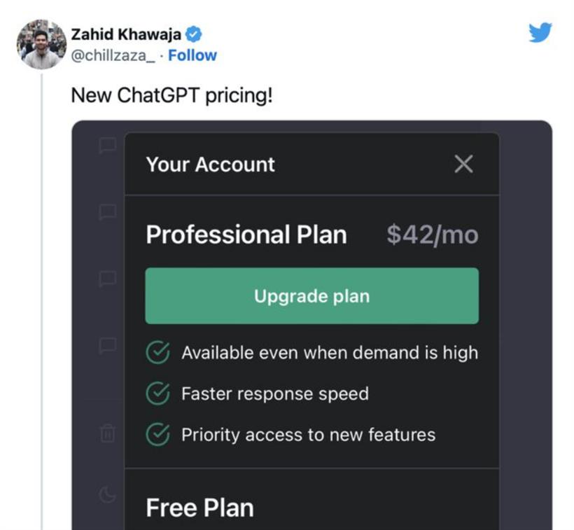 一位名叫Zahid Khawaja的AI开发人员在Twitter公开了自己收到的ChatGPT Pro内侧价格截图