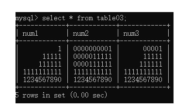 insert into table03 value(1,1,1) insert into table03 value(11111,11111,11111) insert into table03 value(111111,111111,111111) insert into table03 value(12345678901,12345678901,12345678901)