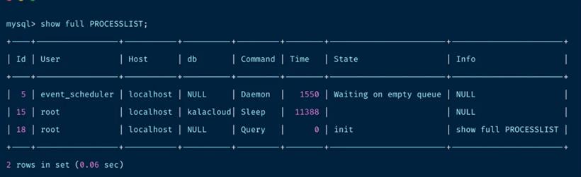 将 kalacloud 替换为你的 MySQL 账号名称,在返回的结果中,Threads 的值为当前连接数,如果当前连接数接近或等于最大连接数,那么就说明 MySQL 连接数已经满了或接近满了。