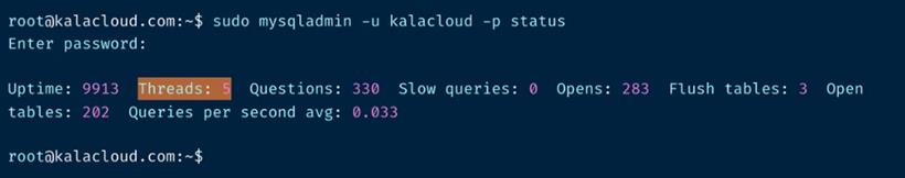 使用 mysqladmin -u kalacloud -p status 查看当前连接数情况