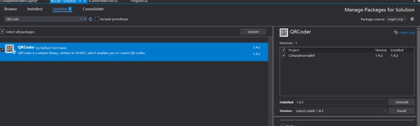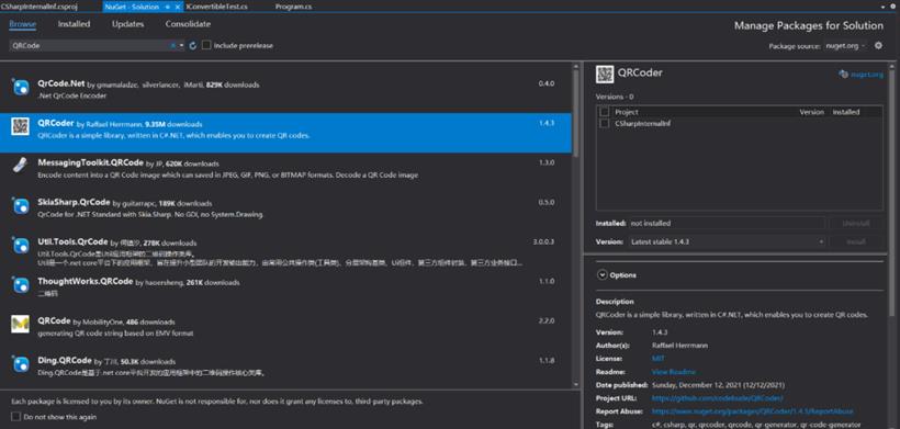 我们还是以QRCoder包为例子,如果从解决方案右键进入此界面,点击这一条后,右侧会显示该解决方案下所有的项目,您需要选择至少一个项目,指定哪个项目要使用这个包,同时在项目选择框下方,您可以选择要引用的版本(系统默认最新稳定版),然后点击“安装”按钮,系统开始下载并自动安装该包,安装时,系统会自动将这个包的依赖一并下载安装,我们静待安装完成即可。