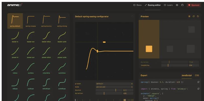 Anime.js 4.2.0 引入了一个全新的缓动编辑器(easing editor),允许开发者在浏览器中实时调整动画曲线。这一工具极大地方便了动画效果的调试和优化,尤其适合需要精细调校的复杂动画。