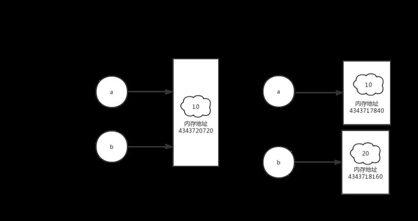 >>> a = 100 >>> b = 100 >>> id(a) 4343720720 >>> id(b) 4343720720 >>> >>> a, b = 10, 20 >>> id(a) 4343717840 >>> id(b) 4343718160 >>> a, b = b, a >>> id(a) 4343718160 >>> id(b) 4343717840 >>>当声明a = 100 和 b = 100的时候,能发现id(a) == id(b),为什么a和b的id值是一样的呢?我们来看一下这个图: