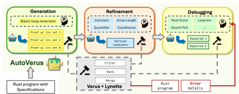 微软对Rust的爱,几乎是写在脸上的。毕竟自家产品深受C/C++内存安全问题的毒害,他们比谁都渴望一个更安全的替代品。微软研究院 (Microsoft Research) 搞了个项目,用LLM来帮你修复Rust代码的编译错误。特别是那些让新手头疼的所有权、生命周期问题,AI能自动给出修改建议,准确率高达74%。这简直是在用魔法打败魔法,极大地降低了Rust的学习门槛。他们把还LLM和一个叫Verus的形式验证工具结合起来,让AI自动为你的Rust代码生成“数学上正确”的证明。
