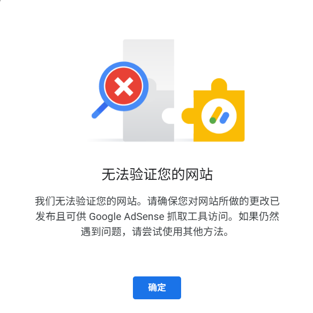网站申请谷歌联盟,添加网站时一直提示无法验证你的网站,不管是用AdSense代码段,还是Ads.txt代码段,还是元标记,三种方式都试过了,还是一直提示无法验证网站:我们无法验证您的网站。请确保您对网站所做的更改已发布且可供 Google AdSense 抓取工具访问。如果仍然遇到问题,请尝试使用其他方法。有谁知道原因的吗?我另一个网站都申请通过了,同样的服务器,同样的设置,为何新的网站一直提示无法验证您的网站?