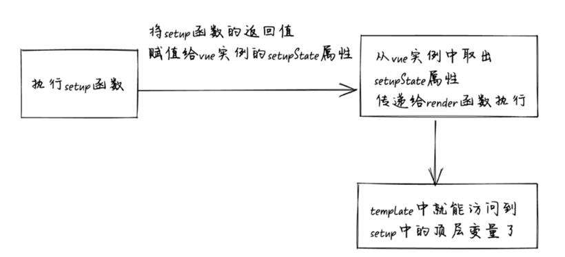 setup语法糖经过编译后就变成了setup函数,而setup函数的返回值是一个对象,这个对象就是由在setup顶层定义的变量和import导入组成的。vue在初始化的时候会执行setup函数,然后将setup函数返回值塞到vue实例的setupState属性上。执行render函数的时候会将vue实例上的setupState属性(也就是setup函数的返回值)传递给render函数,所以在render函数中就可以访问到setup顶层定义的变量和import导入。而render函数实际就是由template编译得来的,所以说在template中就可以访问到setup顶层定义的变量和import导入。