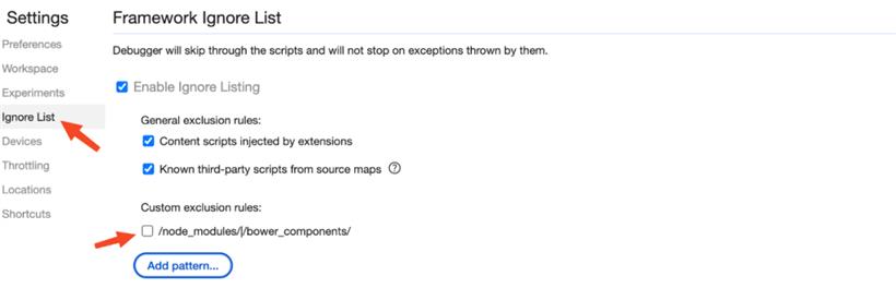 然后我们需要在设置里面的Ignore List看看node_modules文件夹是否被忽略。新版谷歌浏览器中会默认排除掉node_modules文件夹,所以我们需要将这个取消勾选。如果忽略了node_modules文件夹,那么debug的时候断点就不会走到node_modules中vue的源码中去了。