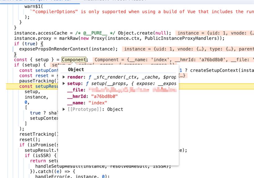 从Component对象中拿到setup函数,然后执行setup函数得到setupResult对象。然后再调用handleSetupResult(instance, setupResult);