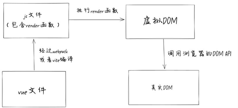 我们的vue代码一般都是写在后缀名为vue的文件上,显然浏览器是不认识vue文件的,浏览器只认识html、css、jss等文件。所以第一步就是通过webpack或者vite将一个vue文件编译为一个包含render函数的js文件。然后执行render函数生成虚拟DOM,再调用浏览器的DOM API根据虚拟DOM生成真实DOM挂载到浏览器上。